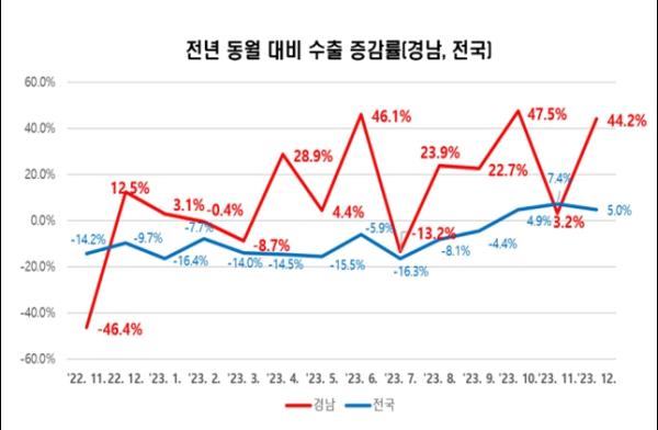 16일 발표된 한국무역협회 수출입 통계에 따르면, 지난해 12월 경남 수출이 전년 동월 대비 44.2% 증가한 48억 달러, 수입은 8.9% 감소한 24억 달러로, 민선 8기 이후 최대 수출 실적을 기록했다.
