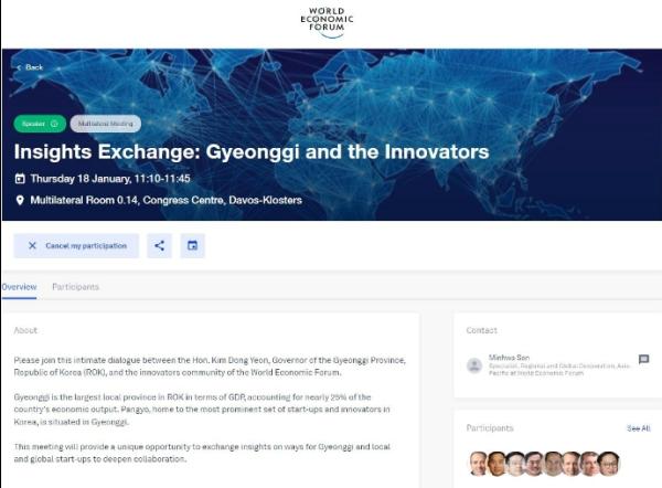 김 지사는 현지 시각 17일 밤 11시 30분(한국 시각 오전 7시 30분) 누리소통망 생방송을 통해 “재밌는 일이 벌어졌다. 세계경제포럼에서 저를 초청하는 유니콘기업(거대신생기업) 세션을 만들었다”라며 세션 개최 소식을 전한 바 있다.