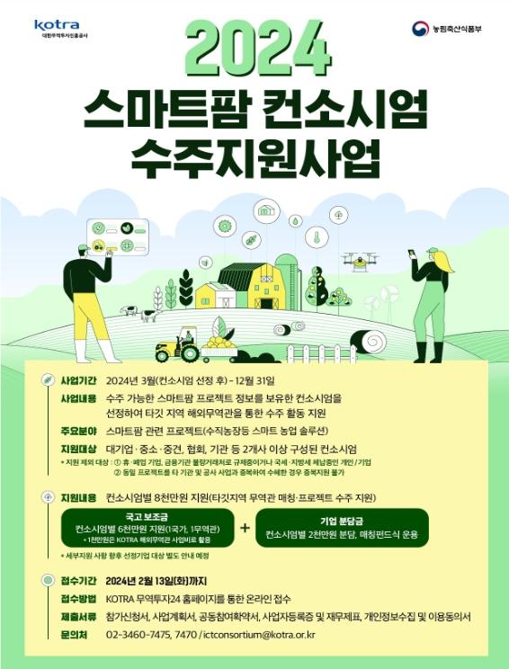 2024년 새롭게 편성된 ‘스마트팜 컨소시엄 수주지원’은 해외 수주 사업 계획을 보유한 지능형농장(스마트팜) 수출기업 컨소시엄을 선발, 해당 사업을 전담·밀착 지원하는 사업이다. 농식품부 관계자는 “기자재·솔루션·재배 기술 등 여러 분야를 묶음으로 제안하는 지능형농장(스마트팜) 수주의 성격상 기업의 단독 수주가 어렵다는 수출업계의 애로가 많았다”며, “이를 해소하기 위해 2024년 기업 간 컨소시엄별 지원을 위한 신규사업을 편성했다”고 밝혔다.