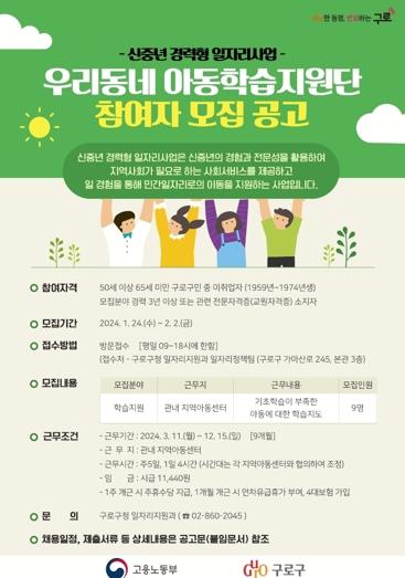 구로구가 2024년 신중년 경력형 일자리 사업의 일환으로 우리동네 아동학습지원단에서 근무할 참여자를 모집한다.