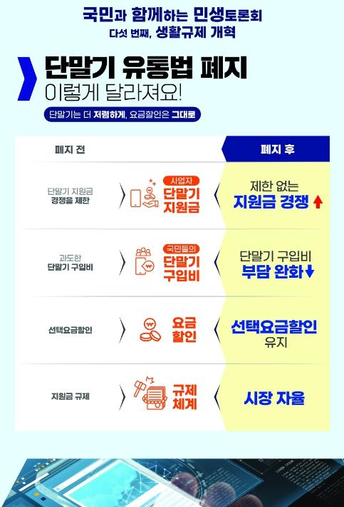 정부는 통신사, 유통점간 자유로운 지원금 경쟁을 촉진하고, 국민들이 저렴하게 휴대전화 단말을 구입할 수 있는 기회를 제공하기 위해 현행 '이동통신단말장치 유통구조 개선에 관한 법률(이하 ‘단말기 유통법’)'을 전면 폐지하기로 했다.