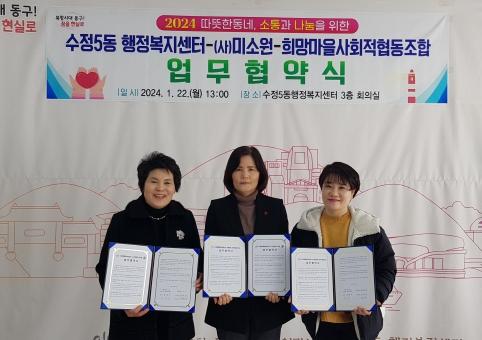 부산 동구 수정5동행정복지센터는 22일, 사단법인 미소원, 희망마을 사회적협동조합과 업무협약(MOU)을 체결했다.
