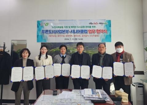 청주시는 지난 22일 임시청사 푸른도시사업본부장실에서 청주상당시니어클럽, 청주우암시니어클럽, 청주서원시니어클럽, 청주흥덕시니어클럽, 청주청원시니어클럽과 ‘노인사회활동사업’지원을 위한 업무협약을 체결했다.