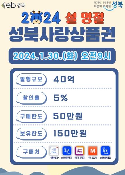서울 성북구가 2024년 설 명절을 맞아 소상공인과 성북구 주민들이 명절의 풍성함을 느낄 수 있도록 1월 30일 오전 9시부터 40억 규모의 설 명절 ‘성북사랑상품권’을 발행한다.