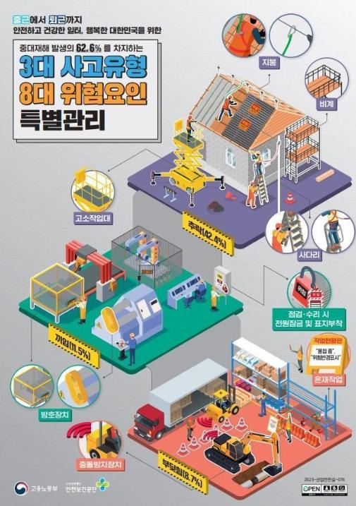 고용노동부와 한국산업안전보건공단(이사장 안종주)은 1월 24일 2024년 제2차 현장점검의 날을 맞이하여 3대 사고유형 8대 위험요인과 강추위로 인한 한랭질환 예방수칙 준수 여부를 점검한다고 밝혔다.