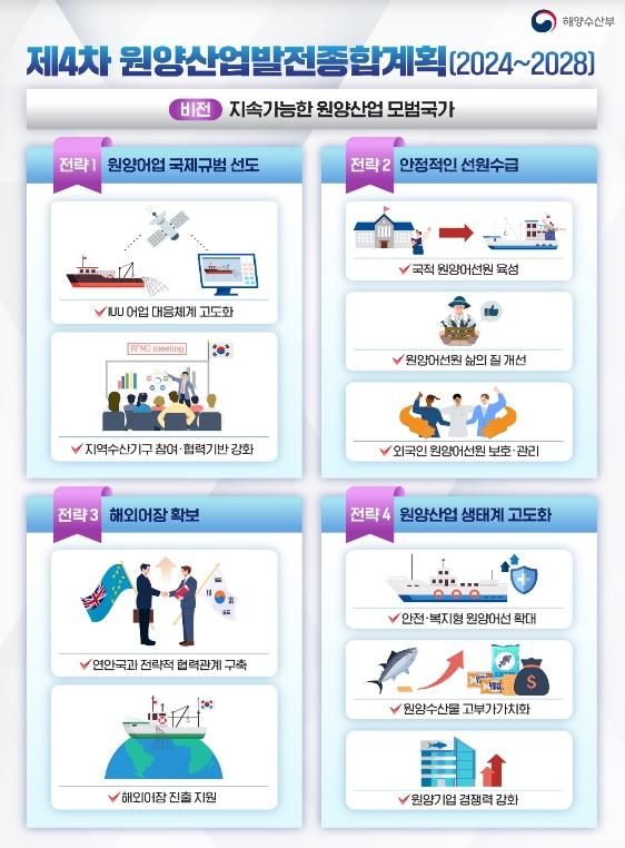 해양수산부는 우리 원양산업의 경쟁력 강화와 지속가능한 발전을 위한 ?제4차 원양산업발전종합계획?을 수립하여 24일 발표했다.