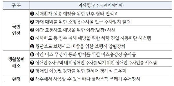 혁신제품을 공모하는 국민 아이디어는 지난해 9월 25일부터 10월말까지 대통령실 국민제안 누리집을 통해 접수된 총 387건의 국민 아이디어 중 전문가들이 국민체감도, 신규성 및 시급성 등의 기준으로 심사를 거쳐 최종 채택된 9개의 우수 아이디어이다.