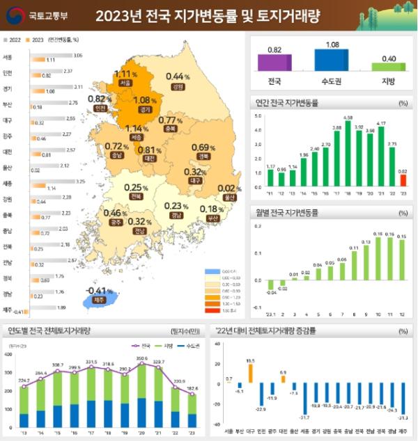 국토교통부와 한국부동산원(원장 손태락)은 '23년 연간 지가변동률 및 토지거래량을 발표했다.