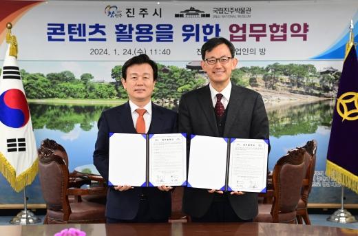 진주시는 24일 시청 기업인의 방에서 국립진주박물관과 콘텐츠 활용을 위한 업무 협약을 체결했다.