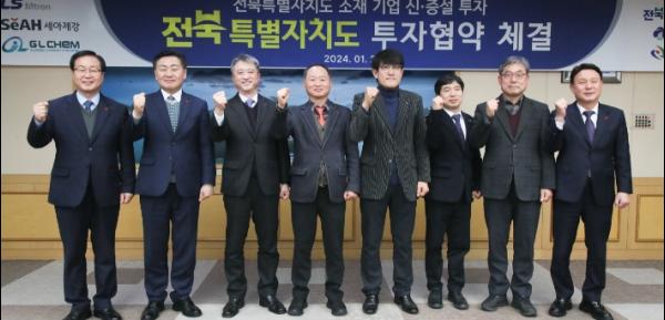 전북특별자치도는 24일 도청 회의실에서 김관영 전북특별자치도지사와 강임준 군산시장, 유희태 완주군수, 최영철 LS엠트론 특수사업부문장, 홍정덕 세아제강 공장장, 이원민 지엘켐 대표 등이 참석한 가운데 투자협약을 체결했다고 밝혔다.