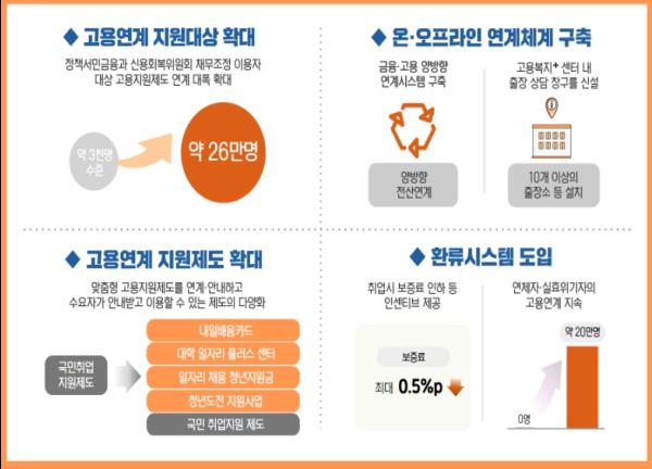 가장 큰 변화는 서민금융진흥원의 정책서민금융과 신용회복위원회의 채무조정 이용자를 대상으로 고용지원제도 연계를 대폭 확대하는 것이다.