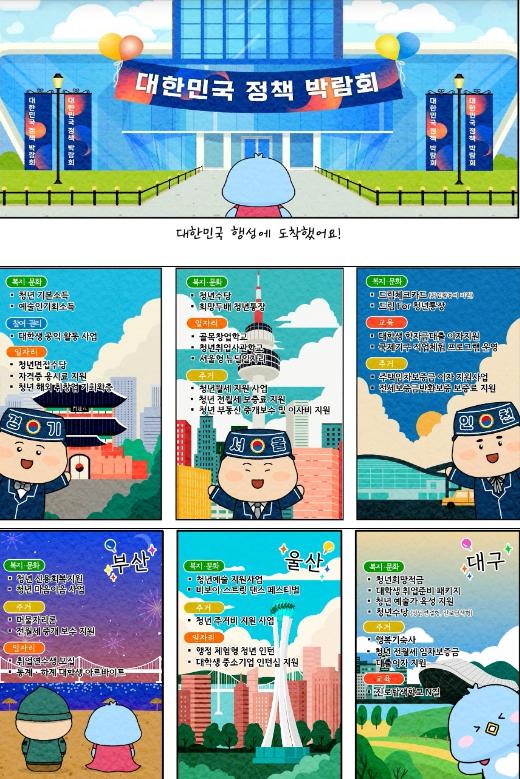 영상에는 서울시(청년수당, 희망두배청년통장), 경기도(청년기본소득, 청년해외 취·창업 기회확충), 인천시(드림체크카드, 드림For 청년통장) 등 시·도에서 시행하는 일자리·주거·교육·문화복지·참여권리 정책이 알기 쉽게 담겨있다.