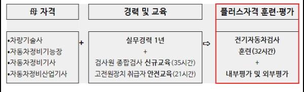 플러스자격 과정에 참여하고 있는 22명의 훈련생은 모두 자동차정비 기사?산업기사 국가기술자격을 취득한 후 1년 이상 실무경력을 쌓고, 전기자동차 정비 관련 법정교육을 이수한 기술 인재이다. 이번 훈련과정을 수료하고 평가를 거쳐 합격하면, 보유 중인 기존 자격증에 ‘전기자동차검사 직무 플러스자격’이 기재되게 된다.