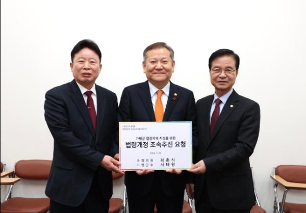 가평군이 인구증대 및 지역경제 활성화를 위해 ‘접경지역 지정을 위한 법령 개정’에 행정력을 집중하고 있는 가운데 서태원 군수는 25일 국회를 찾아 군민들의 목소리를 전달했다.