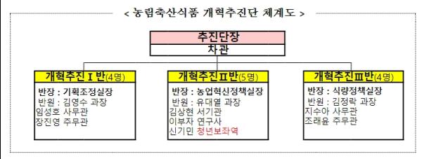 개혁추진단(단장: 한훈 농식품부차관)은 개방적·창의적 사고를 토대로 개혁과제를 속도감있게 추진하기 위해 1급을 반장으로 하는 3개의 추진반으로 구성됐다. 각 추진반장은 소속 실·국에 구애받지 않고 개혁적 성향을 지닌 직원(청년보좌역 포함) 3~4명을 반원으로 선발했으며, 현장 체감도를 높이기 위해 외부 전문가도 포함했다.