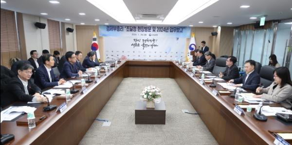 이날 조달청 업무보고는 현장과 소통을 강화하는 ‘현장방문형 외청 업무보고*’의 일환으로 지난 1.23(화) 국세청 업무 보고에 이어 두 번째로 실시된 것으로 이상윤 조달청 차장, 임형철 기획재정부 국고국장 등 양 기관 주요 간부들도 동행했다.
