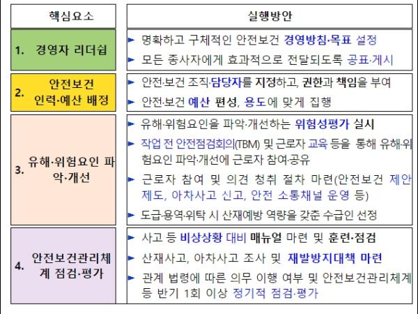안전보건관리체계 구축·이행을 위해서는 (1)경영자의 리더쉽, (2)인력·예산 등 자원 배정, (3)유해·위험요인의 파악·개선, (4)안전보건관리체계를 점검·평가하는 등 핵심요소를 실행해 나가야 한다.
