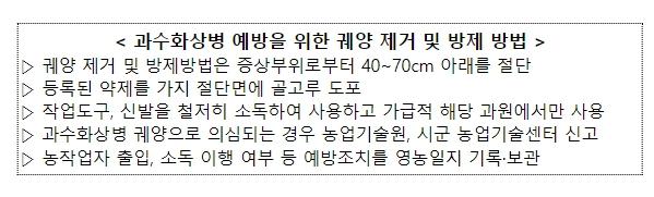 아울러, 농식품부는 사과·배 등 과수에 큰 피해를 주는 과수화상병의 병원체가 겨울철에는 궤양부위에 주로 분포하는 점을 감안하여, 겨울철 궤양제거를 통해 사전에 전염원을 줄일 수 있도록 농가가 궤양 제거에 적극 협조하여 줄 것을 당부했다.