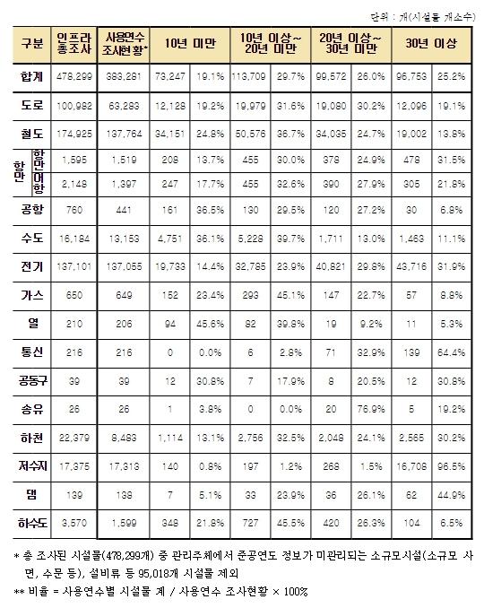 조사된 478,299개 시설물 중 준공일자 확인이 불가능한 설비류, 소규모 시설 등을 제외하고 383,281개 시설의 노후화 현황을 파악했다.