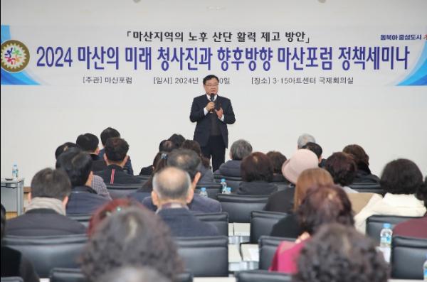 (사)마산포럼(공동회장 한철수, 정광식)의 주최로 열린 이 날 세미나는 마산의 미래를 밝힐 현안사업들의 현 상황과 향후 계획을 알아보고, 그리고 이와 연계한 마산 발전방안 등을 모색하기 위해 마련됐으며, 류효종 창원시 기획조정실장과 이준경 경남대 교수의 주제 발표에 이어 조영태 창원대 교수, 홍정효 경남대 교수, 전정현 한국전자기술 대표이사, 윤봉현 전 마산시의회 의장의 토론이 이어졌다.