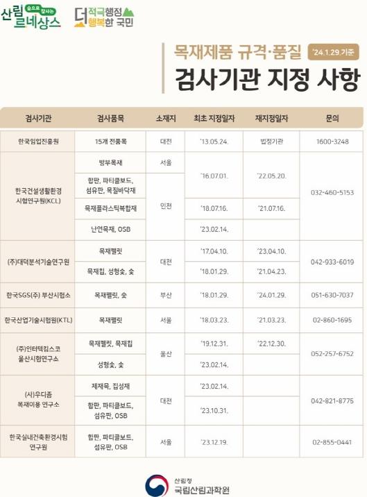 국립산림과학원은 '목재이용법'에 따라 국내에서 생산되거나 수입하여 유통되는 15개 목재제품에 대하여 규격?품질 검사를 할 수 있는 검사기관을 지정하고 있다.