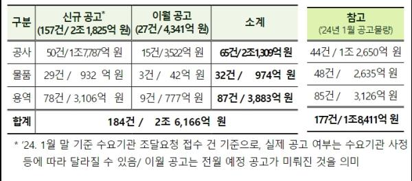 조달청은 ‘24년 2월 한 달 동안 총 184건 2조 6,166억 원 상당의 대형사업(물품·용역 10억원, 공사 100억원 이상) 경쟁입찰 공고를 추진한다.