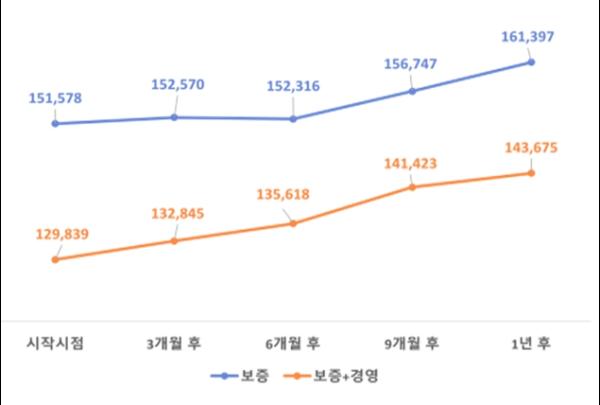 서울시의 경영+금융지원을 종합적으로 받은 기업과 금융지원만 받은 기업 각 1,090곳의 1년 후 연평균 매출 증가율을 분석한 결과 종합지원을 받은 기업의 매출액 증가율은 10.7%로, 평균 1,384만 원 증가한 것으로 조사됐다. 금융지원만 받은 기업(6.5%, 연 982만원)에 비해 4.2%p 매출액이 더 증가한 것으로 나타나 경영지원을 함께 받은 기업의 매출액 개선 효과가 높다는 것을 알 수 있다.