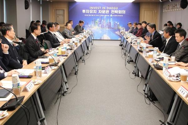 대구광역시는 미래 50년 도약을 위한 전략적 투자유치 활동 강화를 위해 1월 31일 오후 산격청사에서 정장수 경제부시장과 투자유치 자문관 등 30여 명이 참석한 가운데 ‘투자유치 자문관 전략회의’를 개최했다.