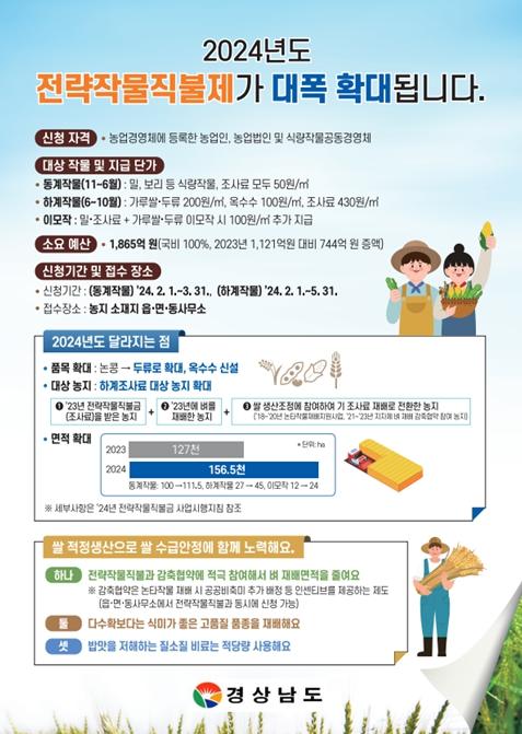 경상남도는 2월 1일부터 전략작물직불사업을 확대 시행한다. 전략작물직불사업은 식량자급률을 증진하고 쌀 수급안정과 논 이용률을 제고하기 위해 논에서 전략작물을 재배하는 농업인 등에게 직불금을 지원하는 사업이다.