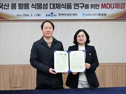 충북농업기술원은 1일 농업회사법인 (주)뜨란과 충북에서 생산한 콩을 활용한 대체단백식품 개발 등 상호협력을 강화하기 위하여 MOU를 체결했다.