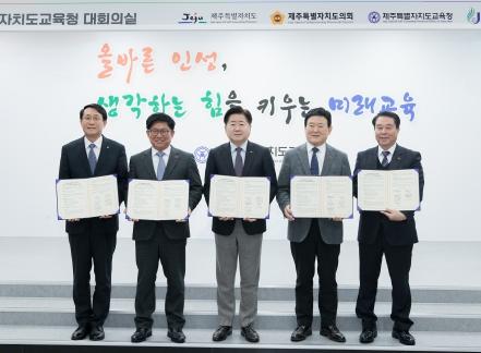 제주 교육혁신을 통한 지속가능한 제주 조성을 위해 제주도와 제주도의회, 제주도교육청, 제주대학교, 제주국제자유도시개발센터(JDC) 등 도내 5개 주요기관이 하나로 뭉쳤다.
