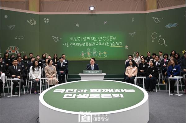 대통령은 늘봄학교 프로그램 참관에 이어 아홉 번째 민생토론회를 주재했다. 대통령은 모두 발언을 통해 올해부터 늘봄학교를 전국 모든 초등학교로 확대해 아이 맡길 곳이 마땅치 않아 어려움을 겪는 부모님들의 짐을 덜어주겠다고 밝혔다.