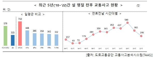 최근 5년(‘18~’22)간 설 명절 전후로 발생한 교통사고를 분석해보면, 연휴 시작 전날이 평소(최근 5년 일평균 579건)보다 1.2배 정도 많은 710건 발생했고, 시간대는 어두워지기 시작하는 18시경에 가장 많았다.