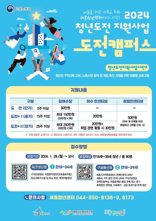 세종시사회서비스원(원장 김명희) 소속시설 청년센터(센터장 홍영훈)는 ‘2024년 청년도전지원사업'도전캠퍼스'’ 참여자 90명을 상시모집 한다.