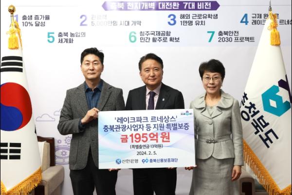 충청북도-충북신용보증재단(이사장 허은영)-신한은행 충북본부(충북본부장 우준식)는 5일 충북도청에서 김영환 도지사 등 관계자들이 참석한 가운데, 도 역점 추진사업인 레이크파크 르네상스 성공 추진과 도내 소상공인 경영 안정화를 위해 충북 관광사업자 등에 대한 금융지원 업무협약을 체결했다.