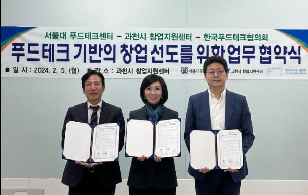 과천시 창업지원센터에서 열린 업무협약식에는 정유정 과천시 창업지원센터장, 권오상 교수(서울대 푸드테크센터), 이기원 한국푸드테크협의회 공동회장이 참석했다.