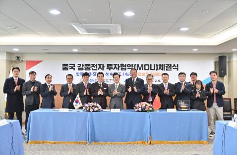 김태흠 지사는 6일 도청 접견실에서 왕쉐쩌 중국 강풍전자 총경리, 박경귀 아산시장과 투자협약(MOU)을 체결했다.