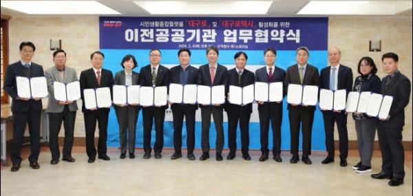 2월 6일 오후 2시 대구시청 산격청사에서 개최된 이번 협약식에는 한국가스공사, 한국부동산원, 한국산업기술기획평가원, 한국교육학술정보원, 신용보증기금, 한국장학재단, 한국지능정보사회진흥원, 한국산업단지공단, 한국사학진흥재단, 중앙교육연수원, 중앙병역판정검사소, 중앙119구조본부에서 참여했으며, 홍준표 대구광역시장을 대신해 정장수 경제부시장이 협약에 서명했다.