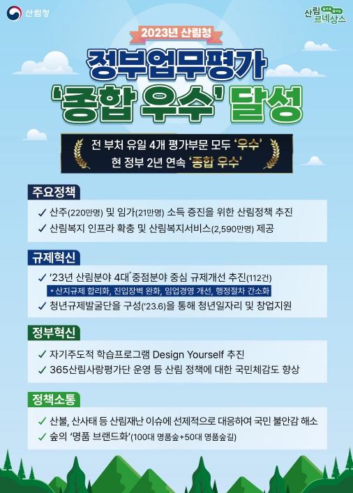 2023년 정부업무 평가에서는 선제적으로 산불, 산사태 등의 산림재난 대응을 강화하여 국민 안전 확보에 기여했고, 산주(220만명) 및 임가(21만명)의 소득증진을 위해 112건의 규제를 개선했으며, 지역사회 발전과 탄소중립· 기후위기 대응을 위한 글로벌 산림협력 성과 등을 인정받아 정부업무평가에서 좋은 성과를 낸 것으로 분석된다.