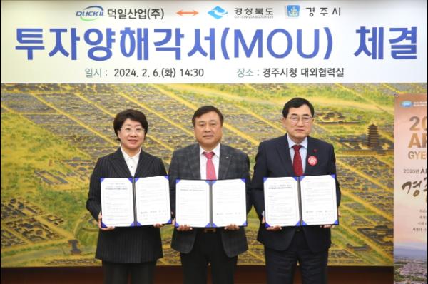 경상북도와 경주시는 6일 덕일산업㈜와 경주시청에서 이달희 경상북도 경제부지사, 주낙영 경주시장, 덕일산업㈜ 유기덕 대표이사 등이 참석한 가운데 차량용 전장부품 생산공장 건립을 내용으로 하는 투자 양해각서(MOU)를 체결했다.