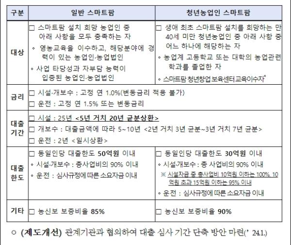 이에 농식품부는 기업과 농가가 보다 쉽게 협력 대상을 찾을 수 있도록 올해안에 ‘계약재배 정보 플랫폼’을 구축하고, 거래 전(前) 시범재배 등 농가-기업간 협력 확대를 위한 다양한 시도를 지원하며, 계약재배 표준약정서도 개발하여 보급하겠다고 했다. 또한 현재 계약재배 지원사업*을 개편하여 계약재배 기간동안 스마트농업 등으로 영농형태가 변경되는 경우 지원기간을 기존 3년에서 3년을 추가 연장하는 등 제도개선을 추진하겠다고 밝혔다. 또한, ‘스마트팜 종합자금’을 통해 지능형농장(스마트팜) 시설 설치를 희망하는 농업인에게 필요한 자금을 융자 지원하고(‘24, 1천억원) 대출 심사기간도 단축하는 등 사업 운영방식도 개선해 나가겠다고 했다.