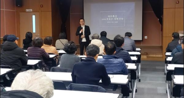 울산동구 사회적경제일자리센터는 2월 7일 오전 10시부터 센터 3층 강당에서 ‘2024년 국내경제 전망’이라는 주제로 특강을 개최했다. 퇴직자 및 지역주민 50여명이 참가한 가운데 2024년 국내경제 전망과 부동산 등 투자환경 변화에 대한 주제로 진행됐다.