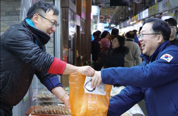 이장우 대전시장은 7일 서구 한민시장을 방문하여 전통시장 활성화를 위해 설맞이 전통시장 장보기 행사를 추진하고 구입 물품을 저소득 가정 등에 전달했다.