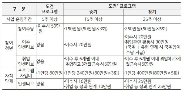 아울러, 프로그램 이수 후 6개월 이내 취업하고 3개월 근속하는 청년에게는 50만원의 취업인센티브가 추가로 지원되며, 도전 이수자에 대한 국민취업지원제도 연계를 강화하여 끊김 없는 체계적인 고용서비스를 제공할 예정이다.
