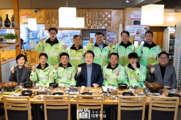 윤석열 대통령은 설 연휴 첫날인 2월 9일 서울 동작구 한 식당에서 연휴에도 거리 청소와 폐기물 수거 등 사회에 꼭 필요한 일을 묵묵히 수행하고 있는 환경공무관들과 조찬을 함께 하고 노고에 감사를 전했다.