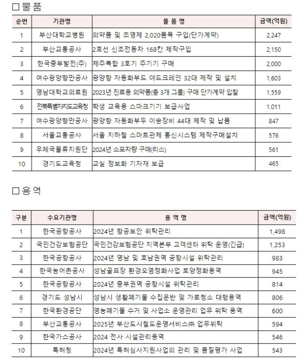 구체적으로는 물품·용역별로 나누어 살펴보면, 물품분야는 여수광양항만공사 수요 ‘광양항 자동화부두 야드크레인 32대 제작 및 설치’ 등 45,285건 61,507억원 발주 예정이며, 용역분야는 국민건강보험공단 수요 ‘국민건강보험공단 지역본부 고객센터 위탁용역’ 등 52,588건 133,260억원 발주 예정이다.