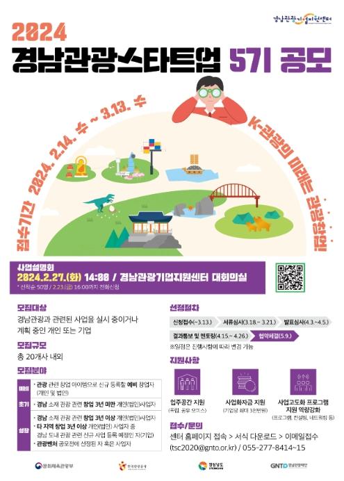 경남관광기업지원센터는 오는 27일 센터 내 대회의실에서 5기 공모 설명과 2024년도 센터 지원사업 설명회를 개최한다.