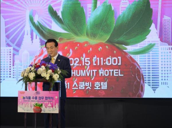 논산시 농식품 해외박람회 일정 이틀째인 15일, 태국 방콕에서 큰 소식을 전해왔다. 현지시간으로 오전 11시 태국의 수쿰빗 S31호텔에서 7개국 (베트남, 미얀마, 라오스, 태국, 일본, 미국, 인도네시아) 40여 명의 바이어가 참석한 가운데 2,300만불(한화 306억 원/8개 업체)규모의 수출을 위한 업무 협약을 체결했다. 품목은 논산의 우수 농산물인(딸기, 배, 포도, 고구마, 젓갈, 인삼 등)이다.