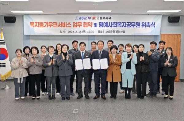 고흥군은 지난 15일 고흥군청 팔영산홀에서 고흥우체국(국장 박동원)과 ‘복지등기 우편서비스 업무 협약’을 체결하고 이날 참석한 집배원에게 명예 사회복지공무원 위촉장을 수여했다고 밝혔다.