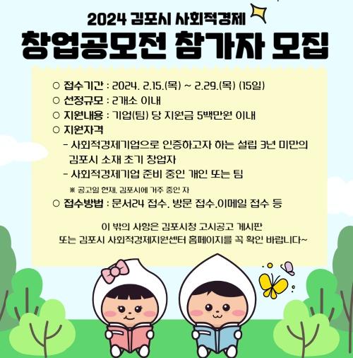 김포시가 취약계층의 일자리 창출, 사회서비스 제공 등의 사회적 가치에 중심을 둔 사회적경제기업을 발굴·육성하기 위한 ‘2024 사회적경제 창업 공모전’을 개최한다.